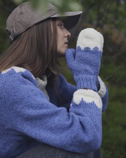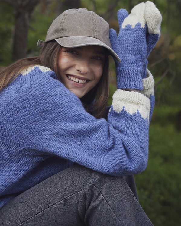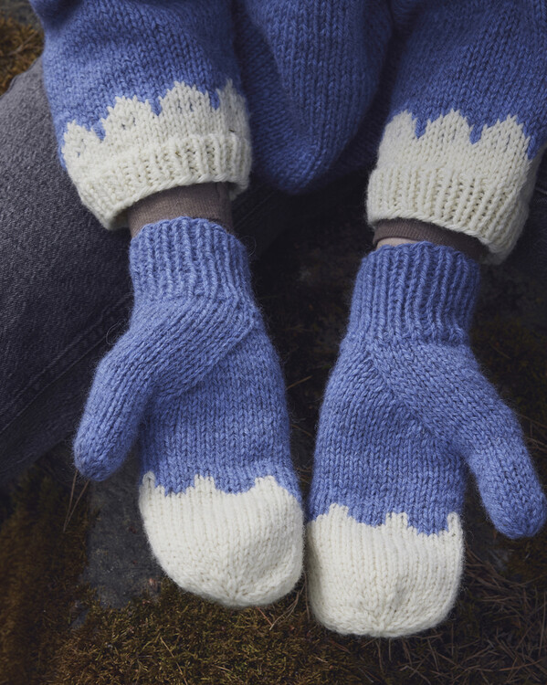 Neulotut lapaset sinisen ja luonnonvalkoisen sävyissä. Koristeellinen kuvio sopii yhteen saman sarjan neulepuseron kanssa. Lapasissa on klassinen muoto, ja varsi on joustinneuletta, joten se istuu miellyttävän napakasti ranteen ympärille.
