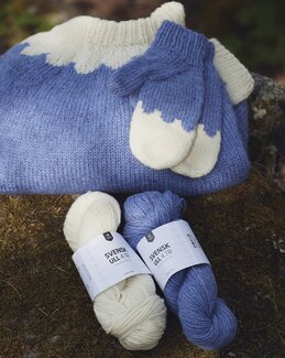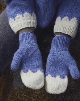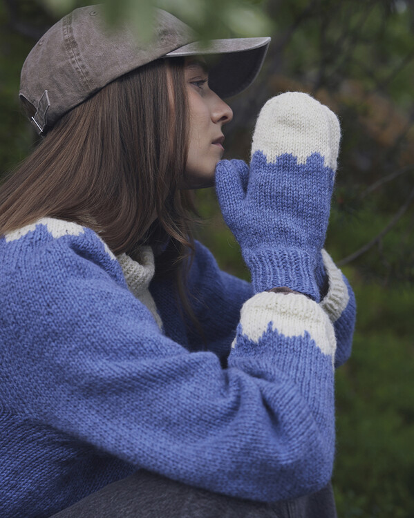 Neulotut lapaset sinisen ja luonnonvalkoisen sävyissä. Koristeellinen kuvio sopii yhteen saman sarjan neulepuseron kanss...