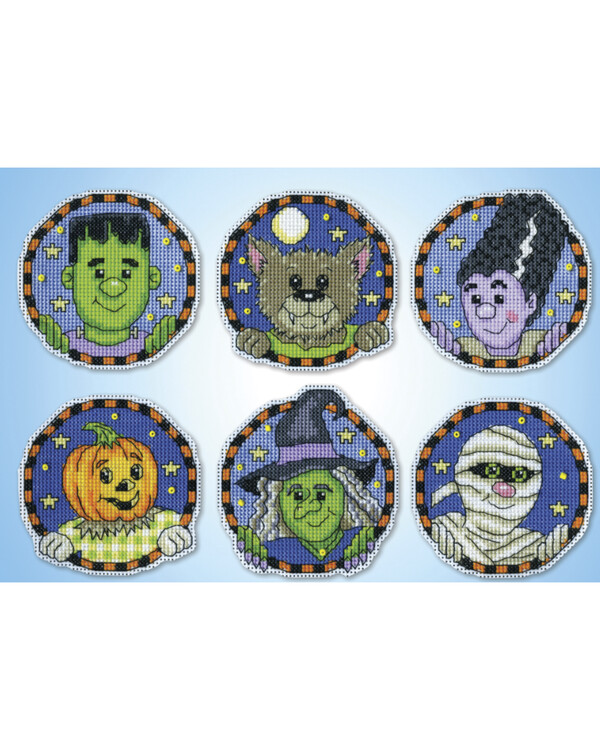 Leikkisä ja värikäs kirjontapakkaus, jossa on kuusi klassista halloween-hahmoa muovikankaalla – täydellinen tapa tehdä o...
