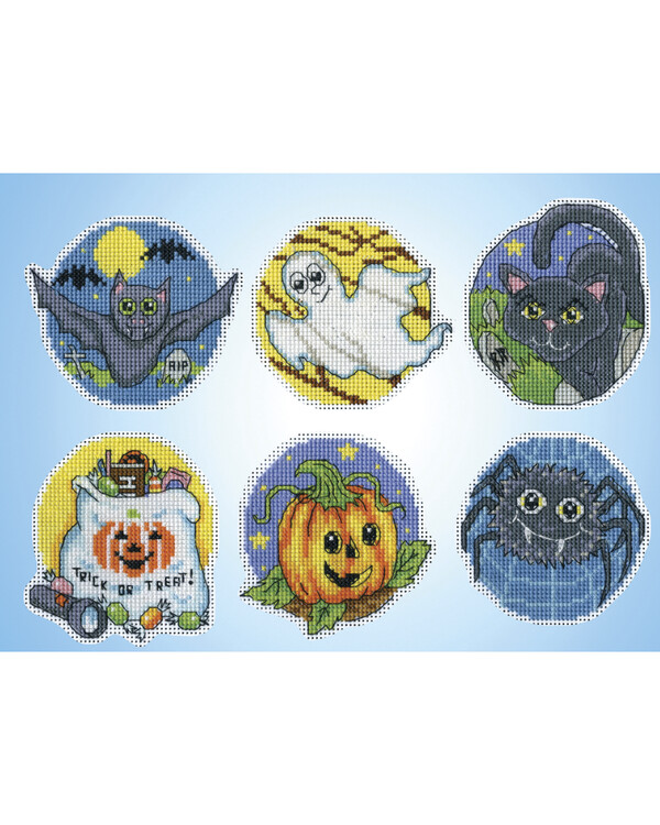Viehättävä halloween-kirjontapakkaus plastic canvas -pohjalle, jossa on kuusi leikkisää kuviota – mukana muun muassa lepakko, kummitus, musta kissa, kurpitsa ja hämähäkki. Täydellinen tapa tehdä omia halloween-koristeita, joita voi käyttää vuodesta toiseen.