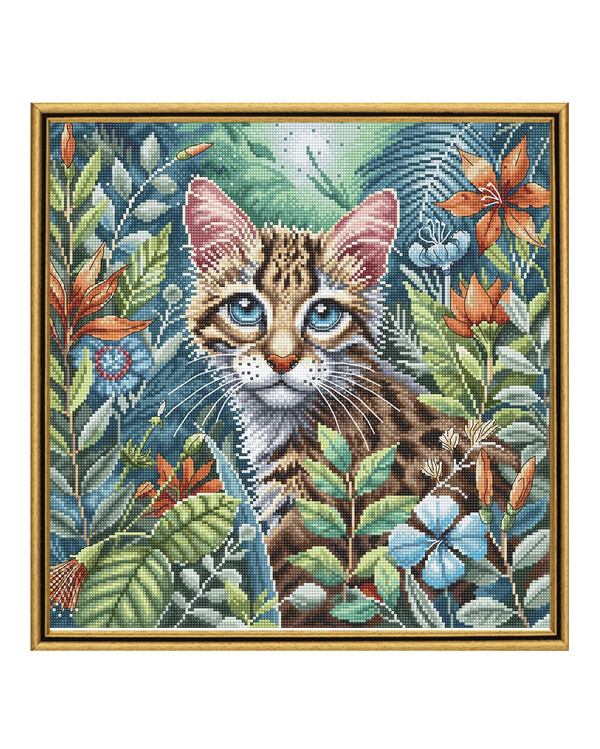 Pääset kirjomaan ilmeikkään ja värikkään ristipistokuvion, jossa kaunis kissa on vehreän kasvillisuuden ja kukkivien kasvien ympäröimänä.
