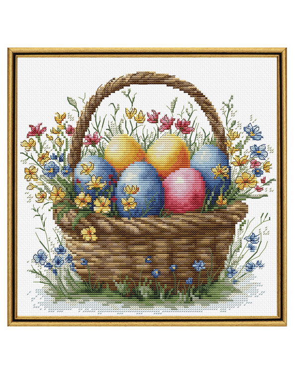 Juhlista kevättä ja pääsiäistä tällä hurmaavalla ristipistomallilla, jossa on klassinen pääsiäiskori täynnä värikkäitä munia ympärillään kevään ensimmäiset puhkeavat kukat.