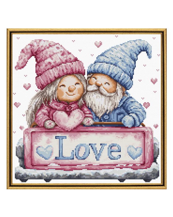 Lämminhenkinen ja hurmaava ristipistomalli, jossa kaksi rakastavaista tonttua pukeutuneina vaaleanpunaiseen ja siniseen pitelevät yhdessä kylttiä, jossa lukee LOVE.