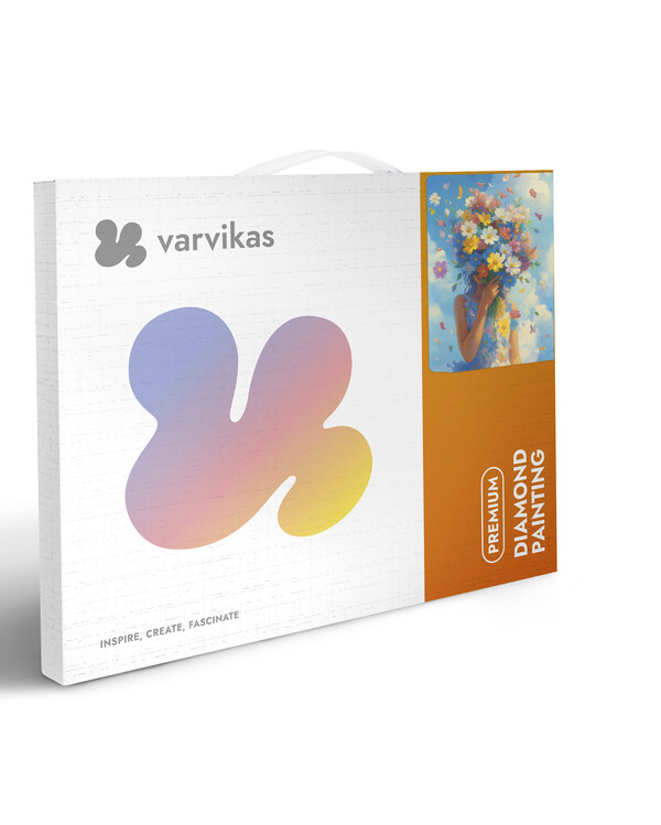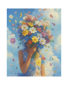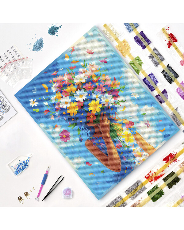 Kaksi kättä pitelee värikästä kukkakimppua kirkkaansinistä taivasta vasten. Iloinen ja inspiroiva diamond painting -kuva...