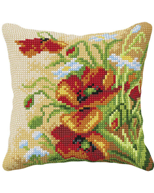 Eloisa tyynykirjontatyö, jossa on punaisia unikkoja ja vihreitä lehtiä. Vahvat värit luovat lämpimän ja energisen tunnel...