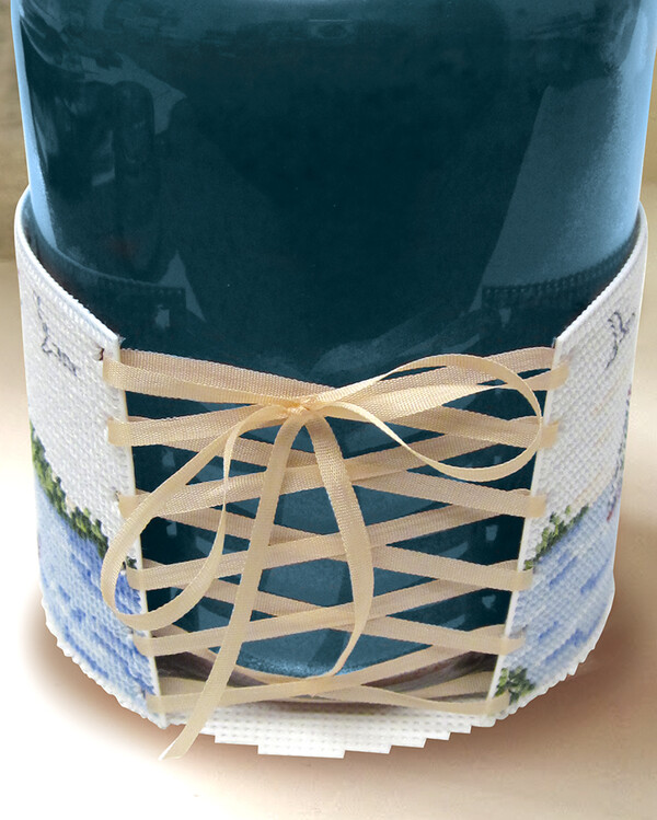 Kirjotaan muuliinilangalla risti- ja jälkipistoja. Valkoinen plastic canvas,5,4 ruutua/cm. Solmimisnauha mukana. Koko n....