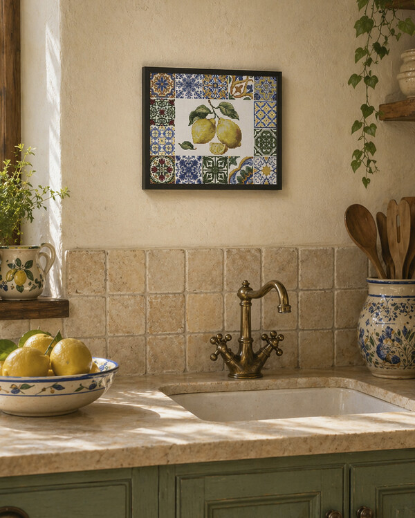 Tyylikäs kirjontamalli, jossa on auringonkeltaisia sitruunoita yksityiskohtaisten, klassisesta Välimeren tyylistä inspiroituneiden kaakelilaattojen ympäröimänä. Koristeelliset kuviot ja kirkkaat värit luovat yhdessä elävän aiheen, jossa on selkeä etelän tunnelma.